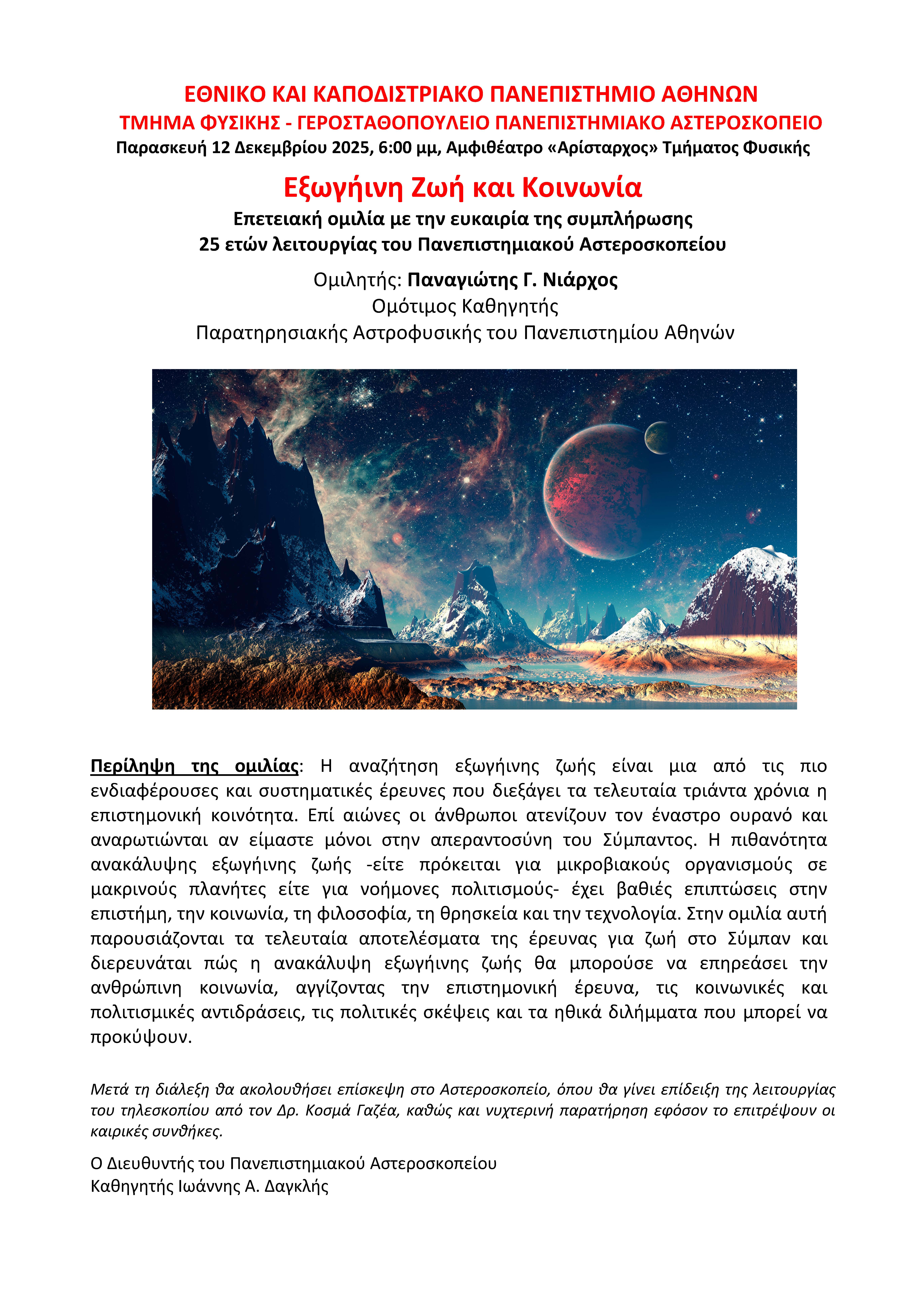 Η επόμενη εκδήλωσή μας είναι η ομιλία του Ομ. Καθηγ. Π. Νιάρχου, στις 12 Δεκεμβρίου 2025, και ώρα 18:00 στο αμφιθέατρο "Αρίσταρχος" του Τμήματος Φυσικής, ΕΚΠΑ.